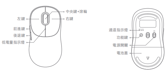 A:Xiaomi 無線滑鼠 3 彩色版有左鍵、前進鍵、後退鍵、中央鍵+滾輪、右鍵、功能鍵、低電量指示燈。背面有通道指示燈、功能鍵、電源開關和電池蓋。