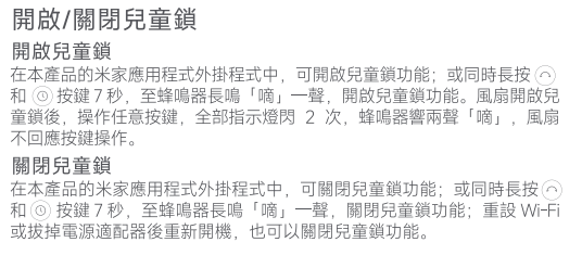 A:長按搖頭鍵及定時調節鍵至蜂鳴器長鳴「嘀」一聲,開啟童鎖功能。或在米家APP中,也可開啟童鎖功能。童鎖開啟後,此時按任一按鍵,所有指示燈閃爍2次,同時聽見「嘀嘀」提示音,風扇不響應按鍵操作。