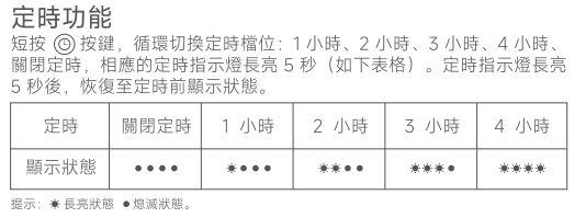 A:短按定時調節鍵,循環切換定時擋位:1小時、2小時、3小時、4小時、關閉定時,對應的定時指示燈長亮5秒(如下表)。定時指示燈長亮5秒後,恢復至風量指示燈模式。