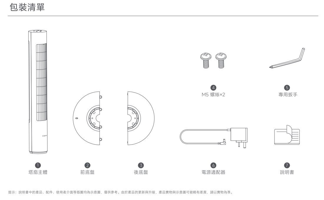 A:Xiaomi 直流變頻塔扇 2包裝清單包括有塔扇主體、前底盤、後底盤、M5螺絲x2、專用扳手、電源適配器、說明書。