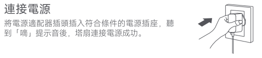 A:將電源插頭插入符合條件的電源插座,聽到「嘀」提示音後,塔扇連接電源成功。