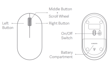 小米無線滑鼠 Lite 2 具有左鍵、中鍵 + 滾輪、右鍵、開/關開關和電池倉。