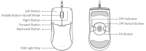 4. 小米遊戲滑鼠 Lite 具有左鍵、中鍵和滾輪、右鍵、前進鍵、後退鍵、DPI 切換鍵和 FN 鍵。