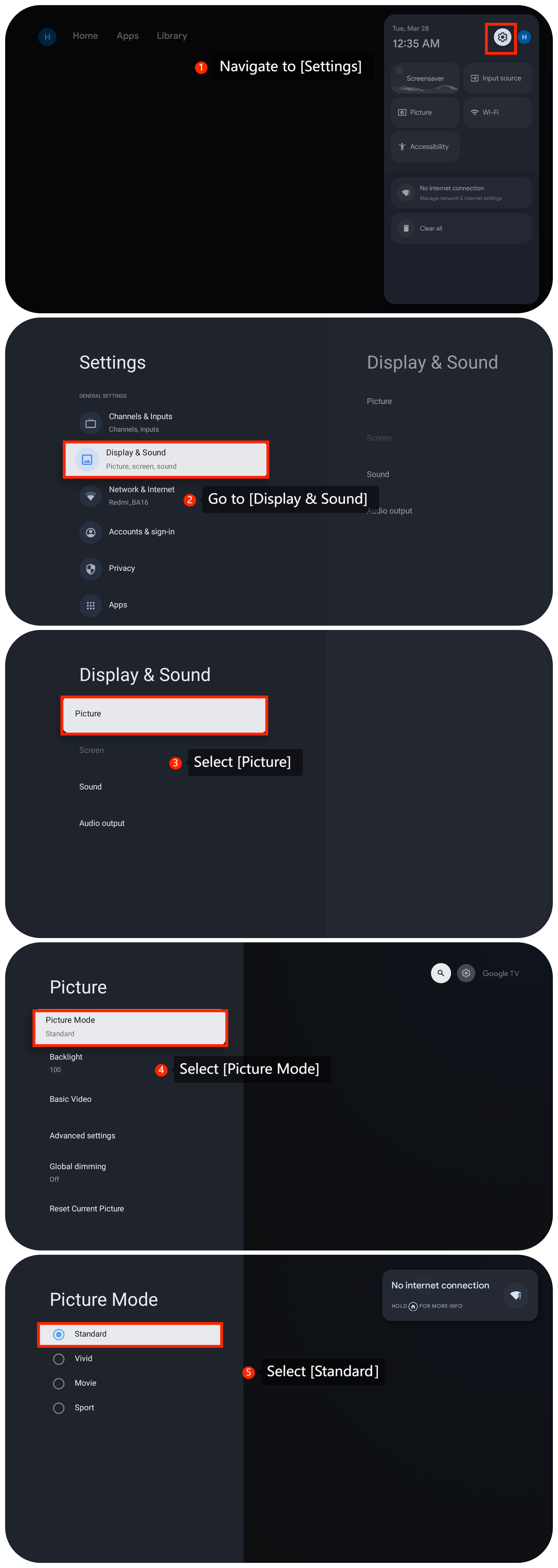 3. 導航到[設置]>>[顯示和聲音] >>[圖片]>> [圖片模式]>> 選擇[標準];