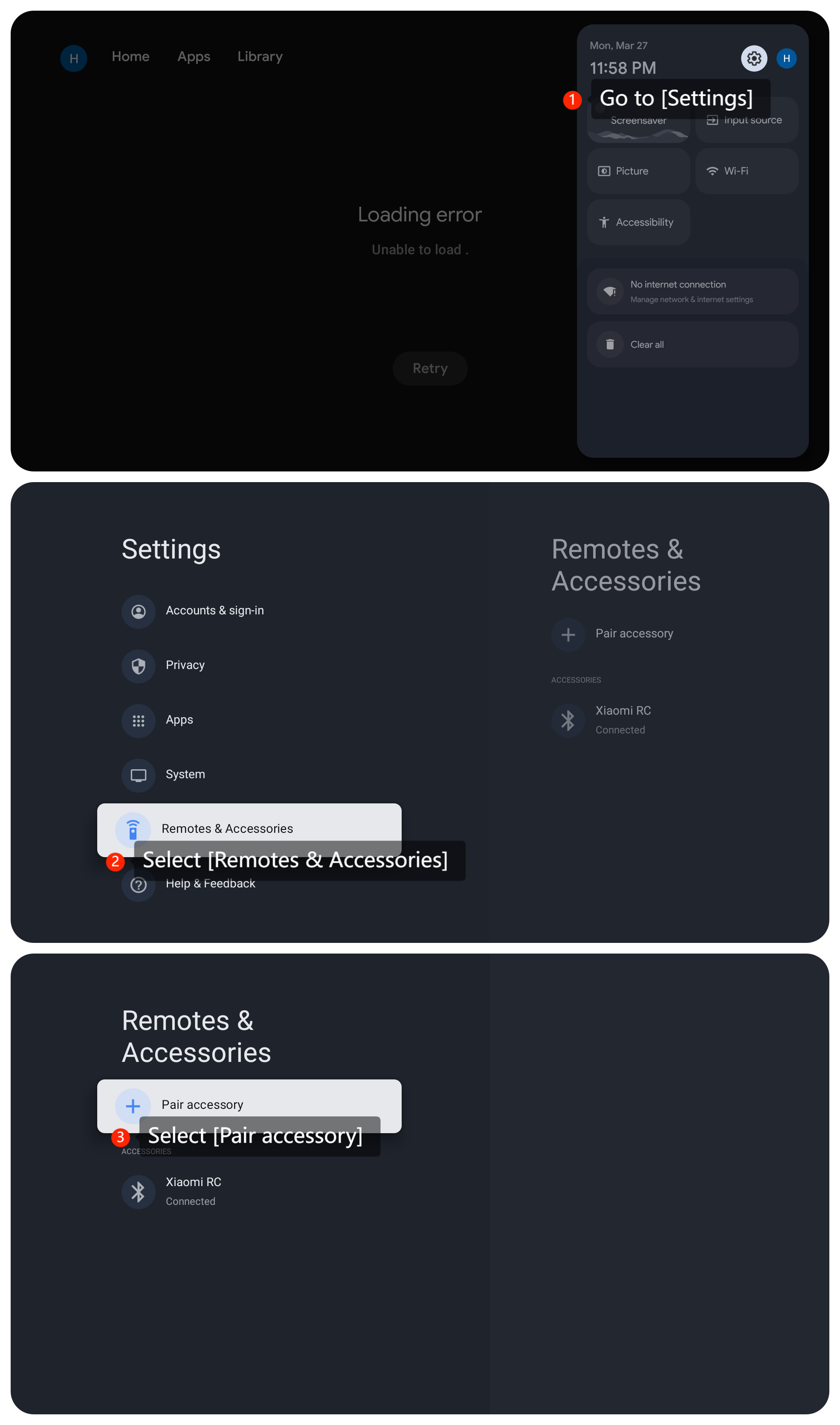 4. 通過導航到 [設置] >> [遙控器和配件] >> [配對配件] >>打開藍牙設備上的 [藍牙] 功能 並與電視配對,將藍牙設備重新連接到電視;