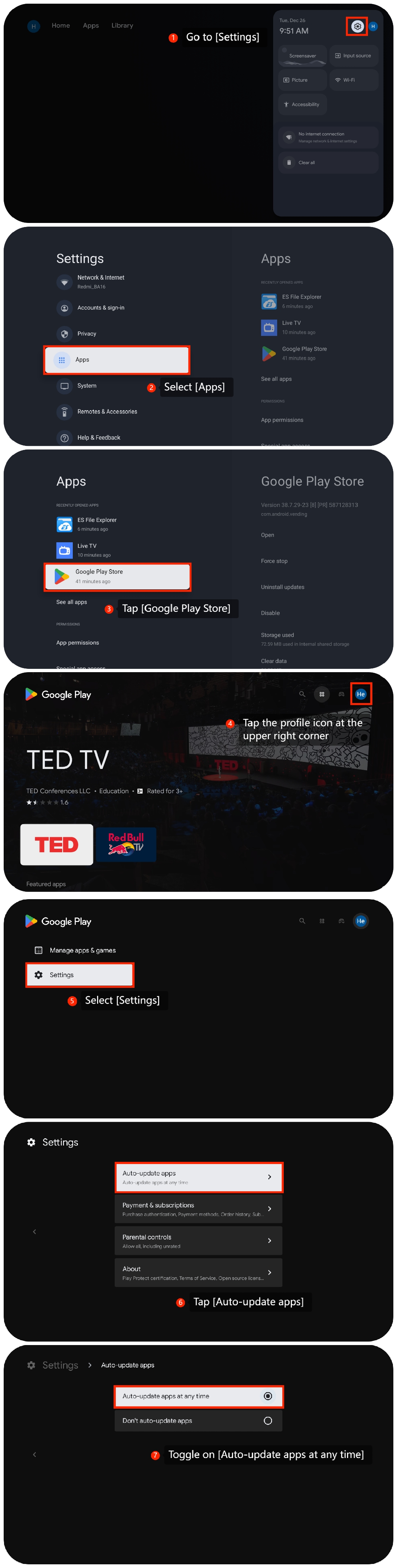 1. 請確保電視機已啟用 [自動更新] 功能。轉到 [Settings] >> [Apps] >> [Google Play Store] >> 點擊右上角的個人資料圖標 >> [設置] >> [自動更新應用程式] >> 切換 [隨時自動更新應用程式];