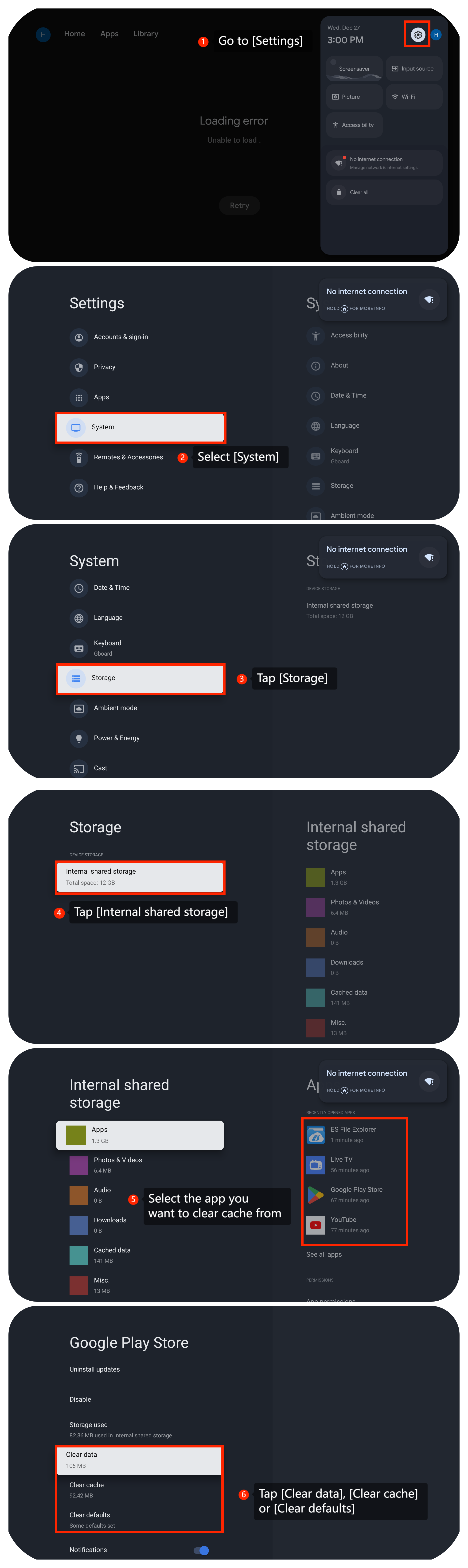 4. 通過轉到【設置】>>【系統】>>【存儲】>>點擊【內部共用存儲】>>選擇要清除緩存的應用>>點擊【清除數據】、【清除緩存】或【清除預設值】,清除遇到問題的流媒體應用的緩存和數據;