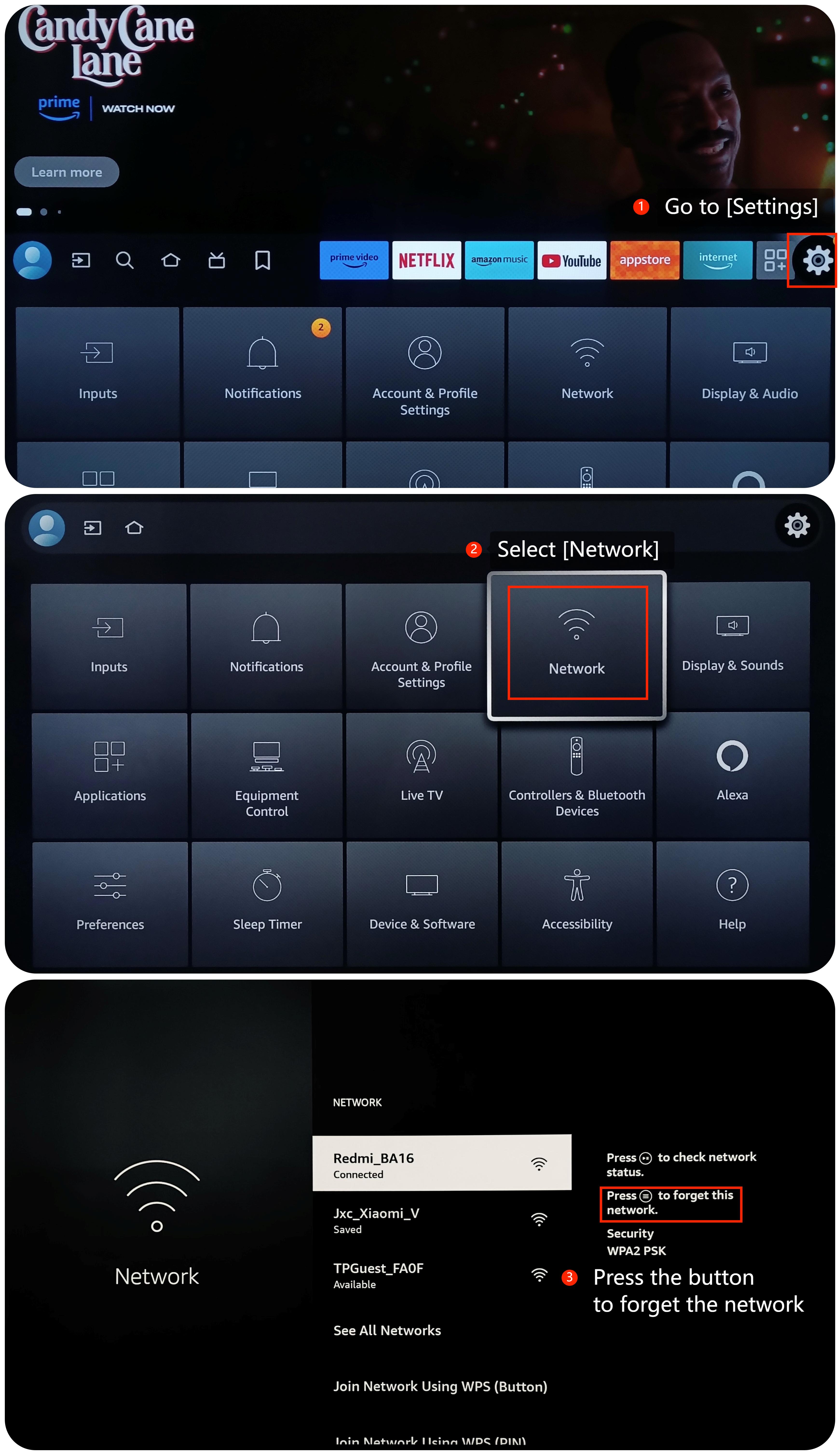 您的Wi-Fi網络,然後按下遙控器上帶有三條水平線的按鈕,忘記並重新連接Wi-Fi
