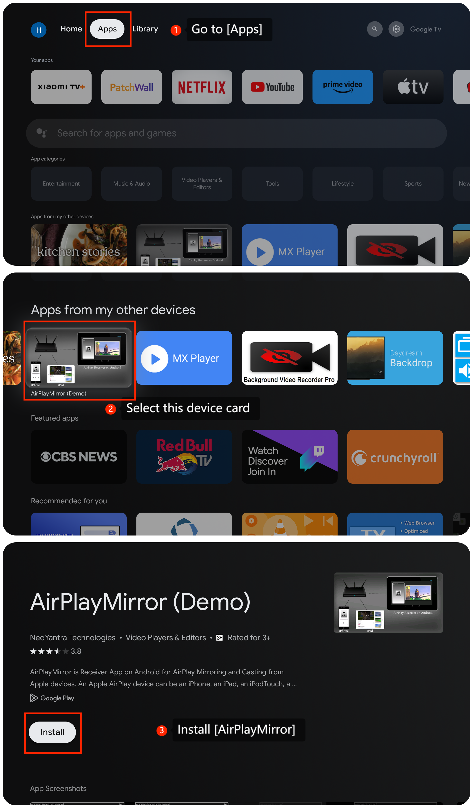 3.確認您的電視已啟用 AirPlay。 通過轉到 [Apps] >> [AirPlayMirror] 並 安裝它來確保它已打開。