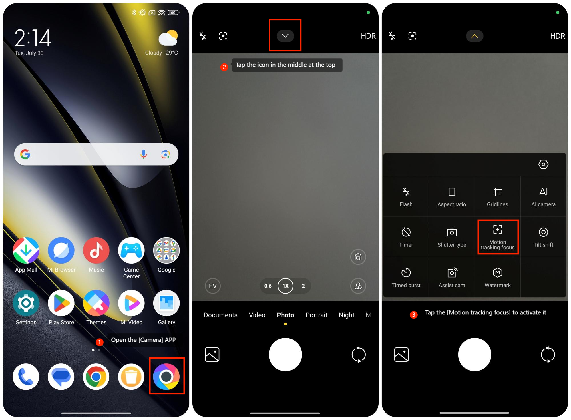 3. 點擊 [運動跟蹤焦點]以啟動它。啟動運動跟蹤后,將攝像頭對準您要跟蹤的移動物體。相機將自動調整焦距並在物體移動時跟蹤物體,有助於保持其清晰和對焦。