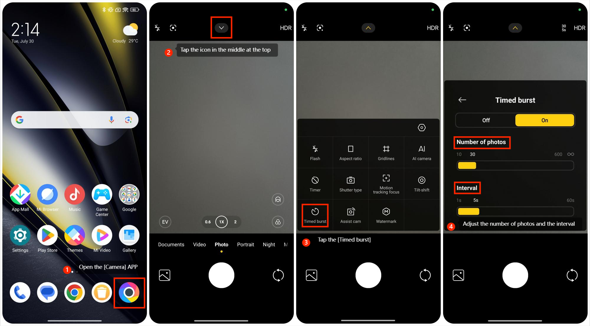 4. 啟動后,您可以拍攝 10 到 600 張照片,並可選擇無限。此外,您可以將拍攝間隔從 1 秒調整為 60 秒。