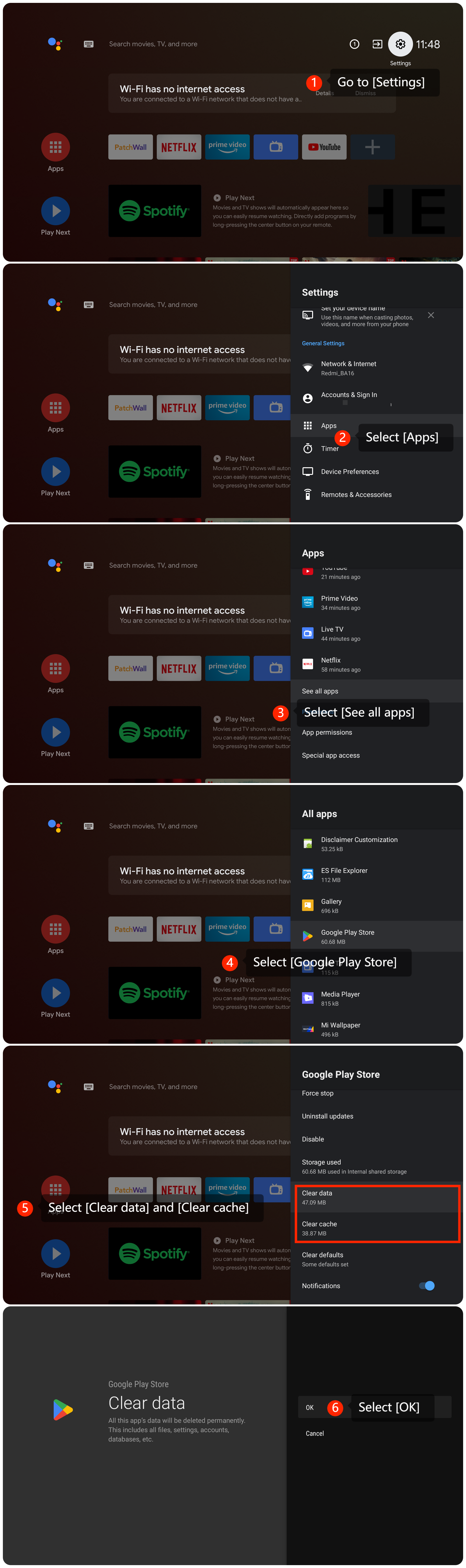 3. 通過轉到 [設置] >> [應用] >> [查看所有pps] >> [Google Play 商店] >> [清除數據] 和 [清除緩存] >> [確定],清除 Google Play 商店的緩存和數據;