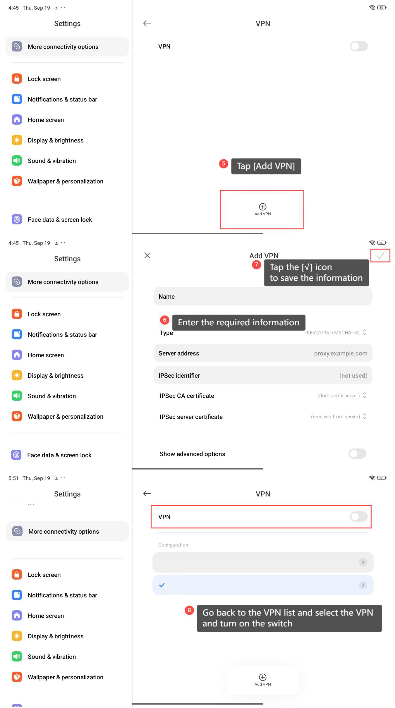 6. 輸入所需資訊,例如 VPN 名稱、類型、伺服器位址以及您的 VPN 服務提供的任何身份驗證詳細資訊;