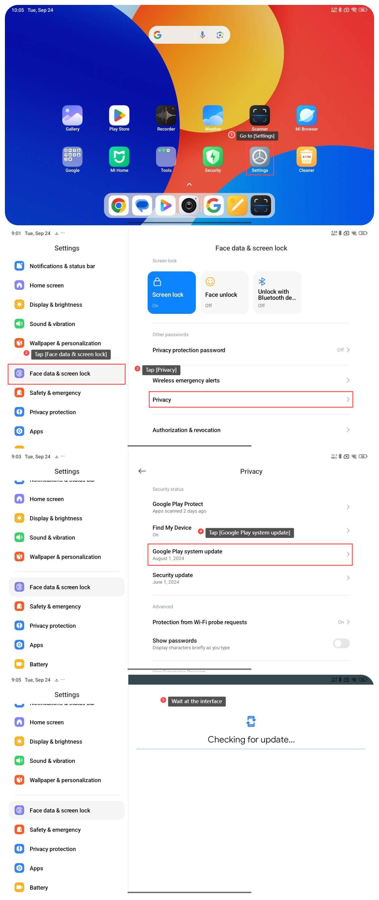 REDMI Pad SE 8.7 4G 支援更新 Google Play 系統,包括漏洞補丁,保護您的設備免受惡意軟體和安全威脅。定期更新可以解決問題和錯誤,從而提高設備的整體穩定性和性能。此外,更新可以優化系統性能,從而加快APP載入時間和更流暢的操作。 在 REDMI Pad SE 8.7 4G 上更新 Google Play 系統,請參考以下步驟: 1. 轉到 [設置]; 2. 向下滑動找到並點擊 [人臉數據和屏幕鎖定]; 3. 點擊 [隱私]; 4. 點選 [Google Play 系統更新]; 5. 在 [檢查更新] 介面等待,然後按照提示更新 Google Play 系統。