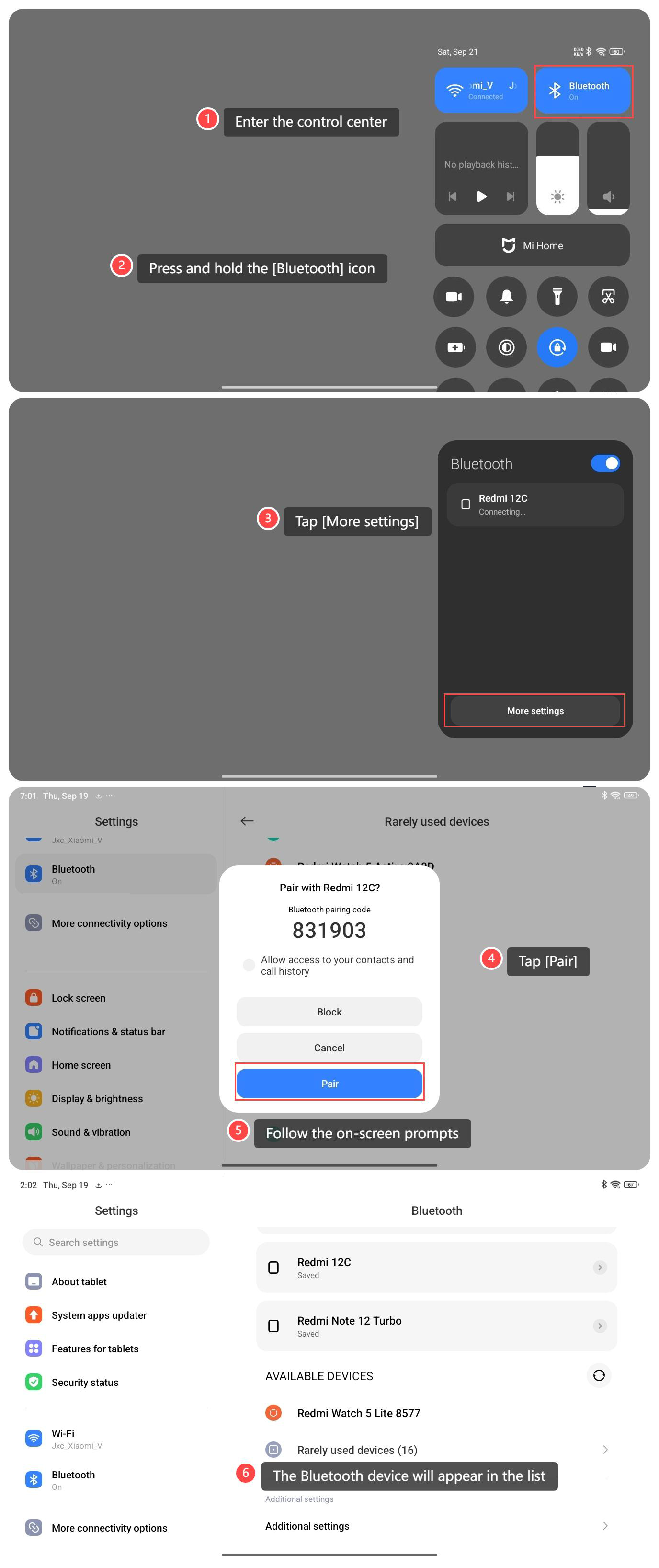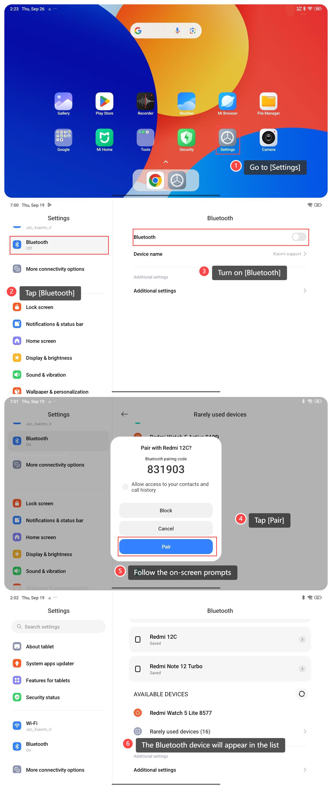 REDMI Pad SE 8.7 上的藍牙功能提供了一種與各種相容設備(如耳機、揚聲器、智慧手錶等)進行無線連接和通信的便捷方式。