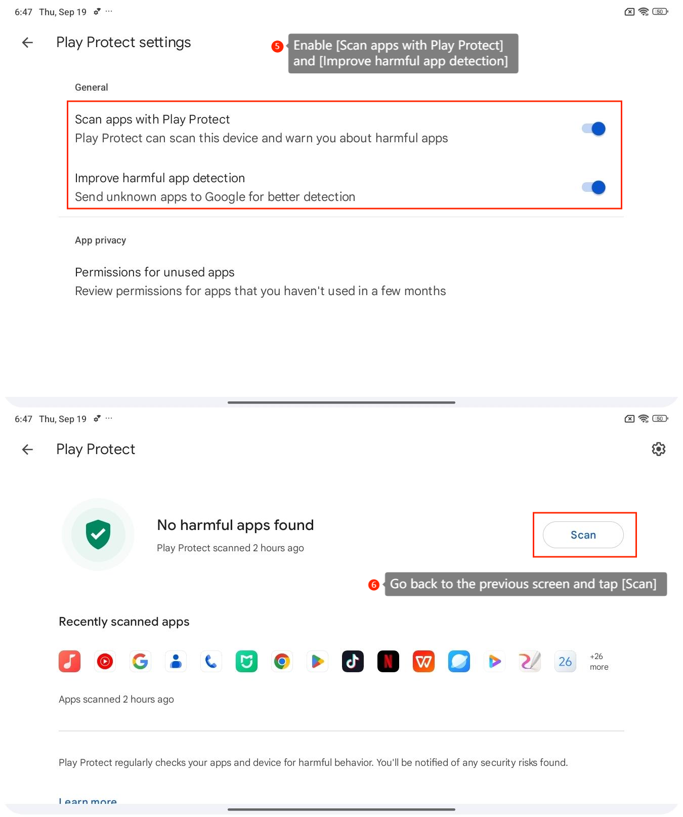 [使用 Play Protect 掃描應用程式]