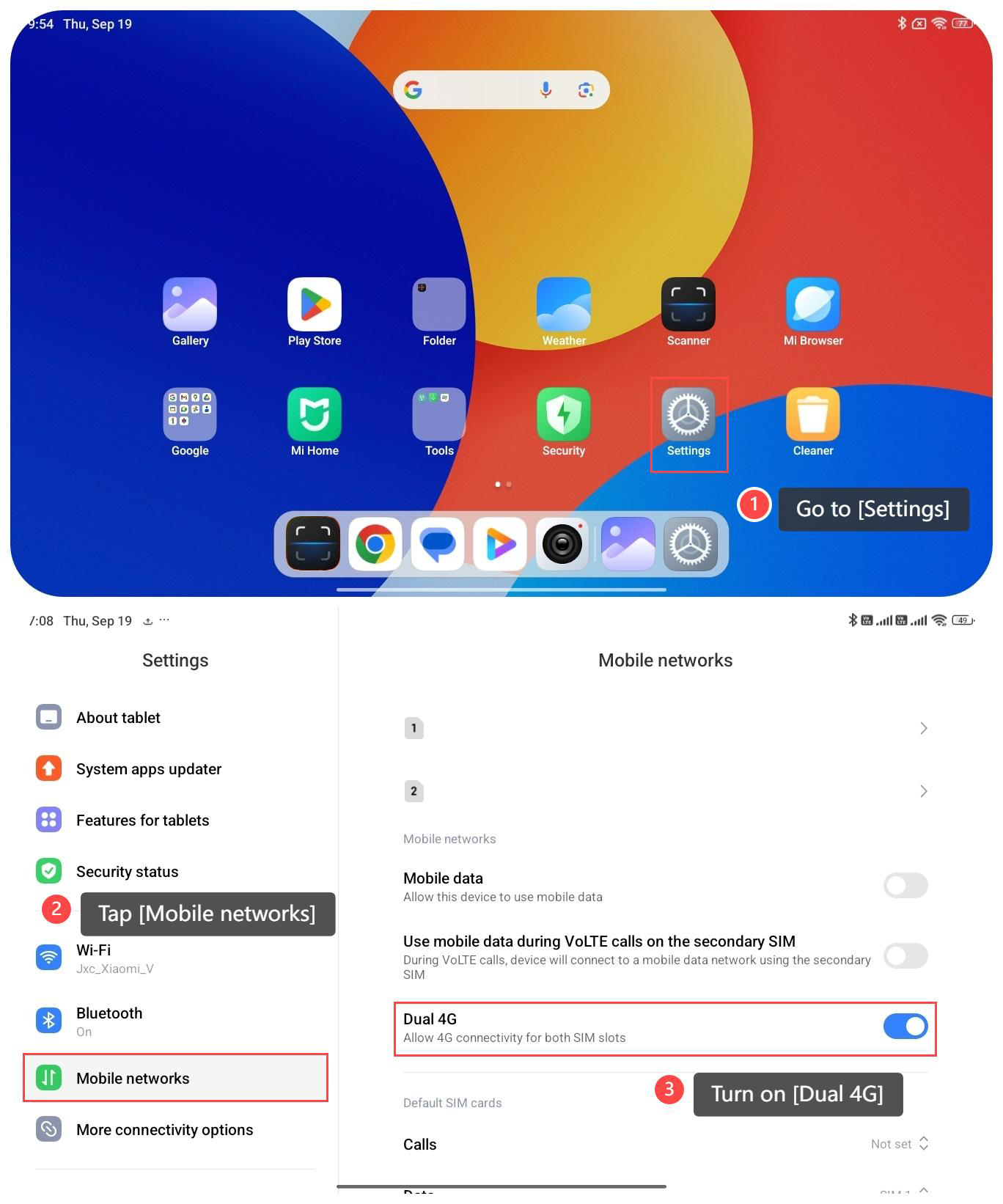 要允許平板電腦上的兩個 SIM 卡插槽進行 4G 連接,請參閱以下步驟: