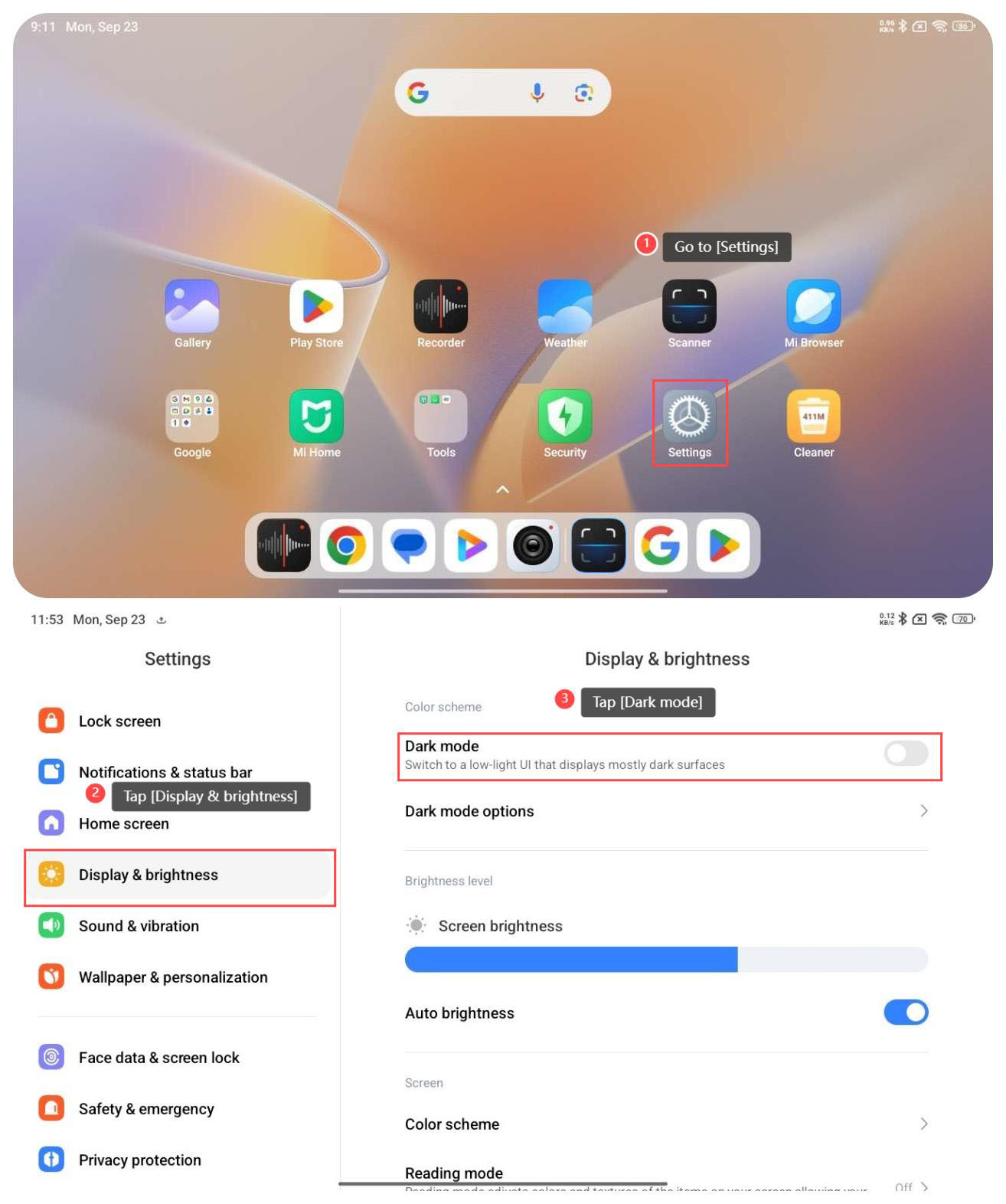要在平板電腦上設置暗模式,請參考以下方法:
