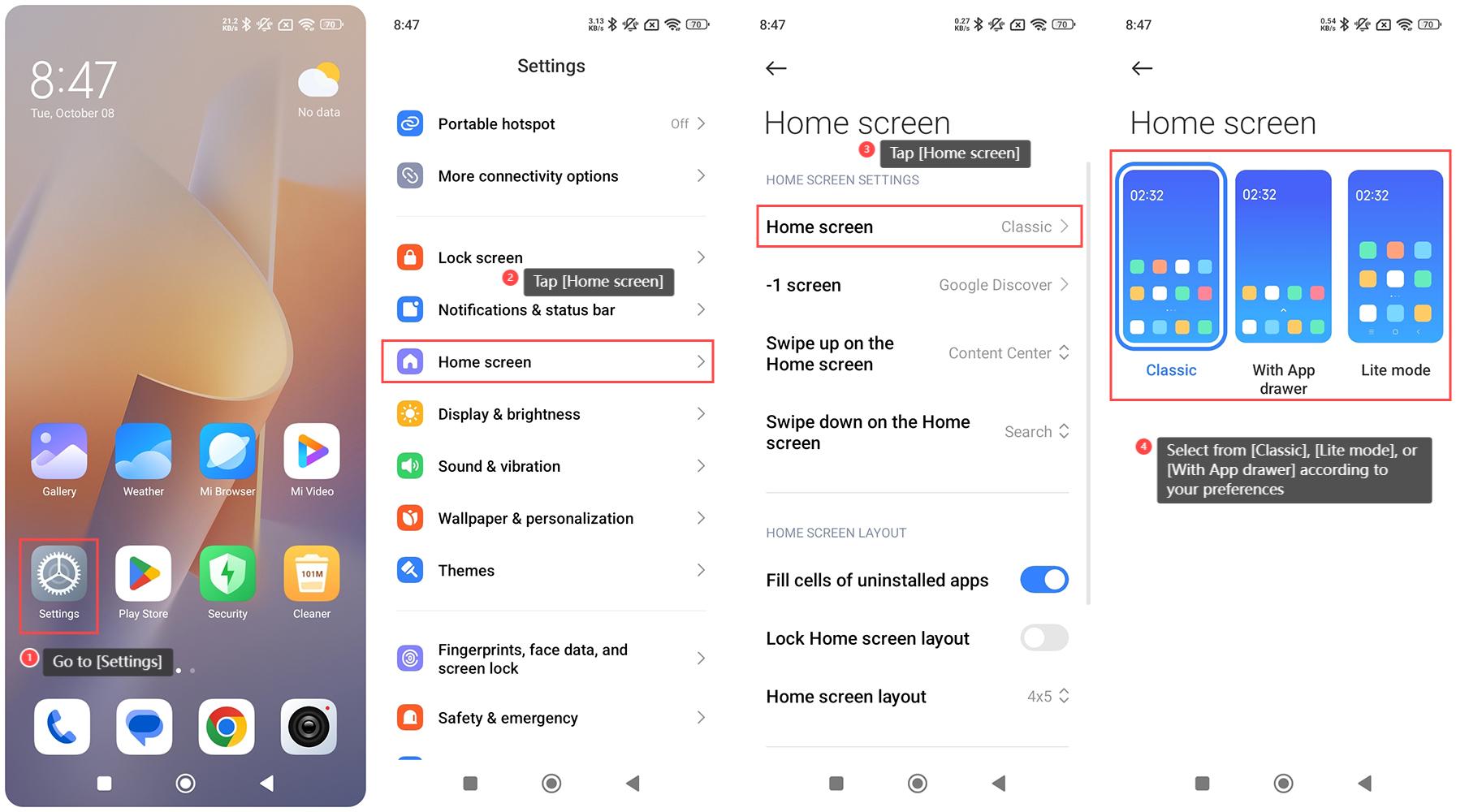如何在 REDMI 13C 上設置主屏幕類型?