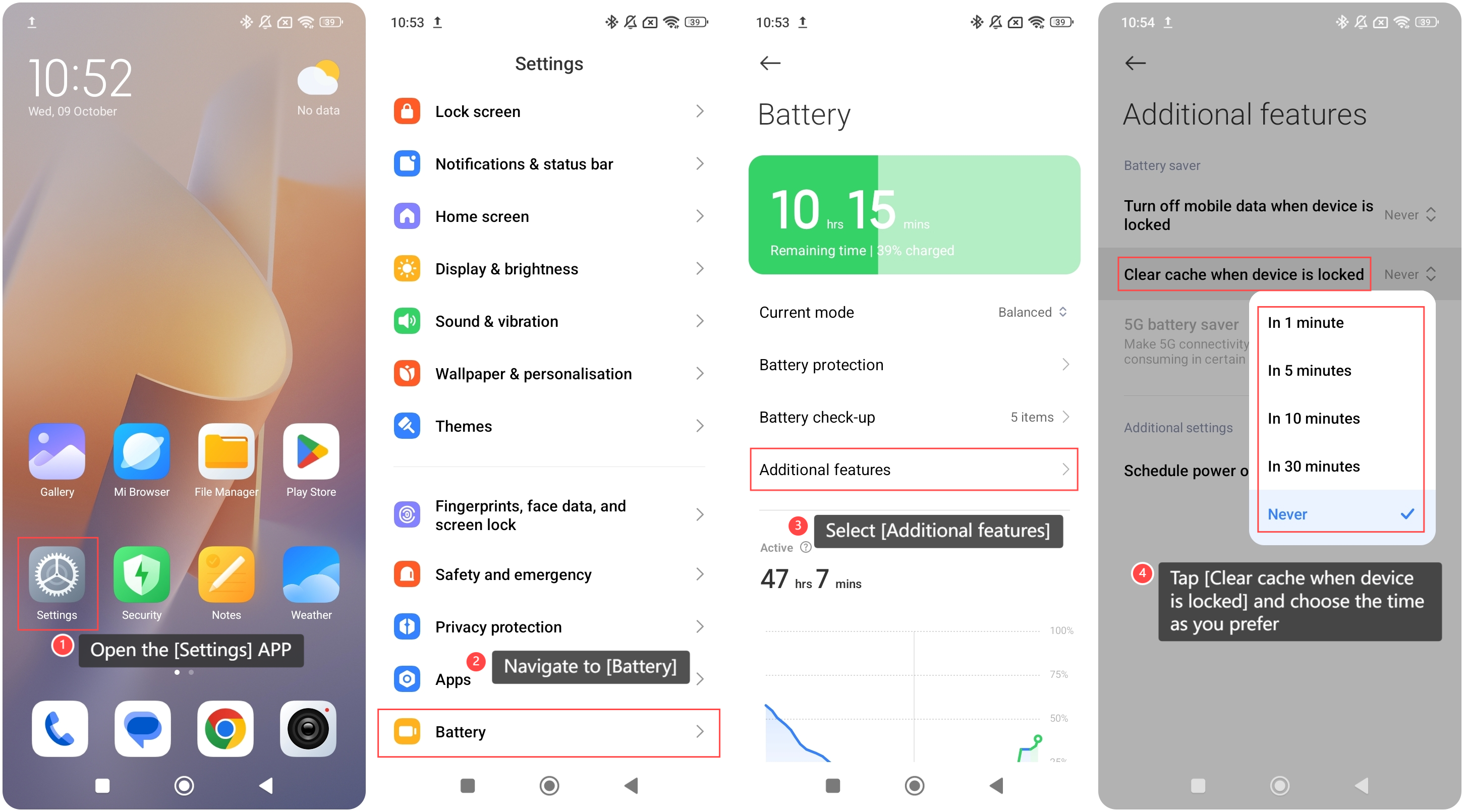 在 REDMI 13C 5G 鎖定時清除緩存有助於釋放存儲空間、提高性能並增強安全性。它確保臨時檔不會累積,這可能會降低系統速度或導致潛在的數據隱私問題。