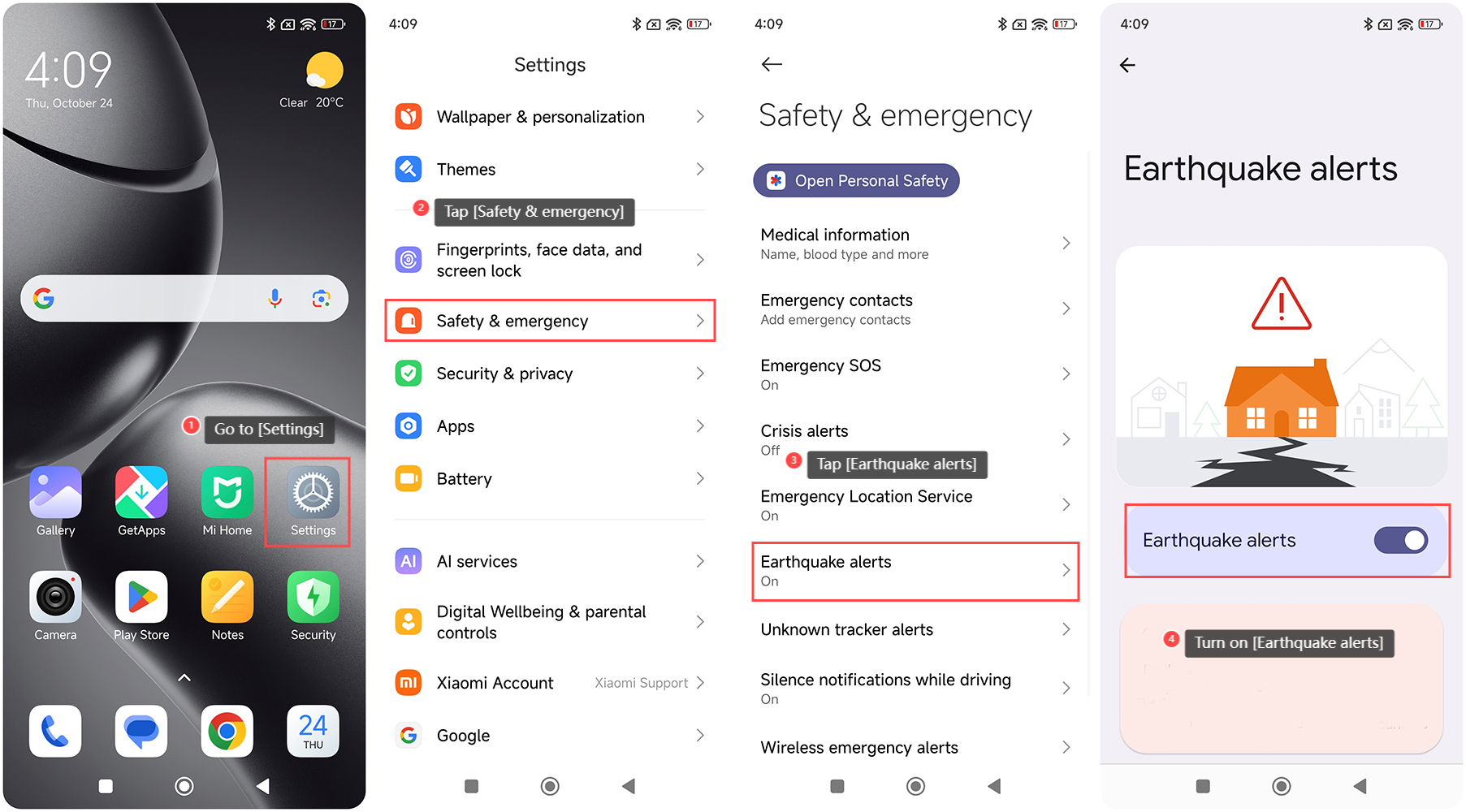 可讓您的設備在附近檢測到地震時提醒您。啟用此功能後,您的設備將及時提供通知,包括地震的初步估計震級和與您所在位置的距離,從而説明您採取必要的預防措施。