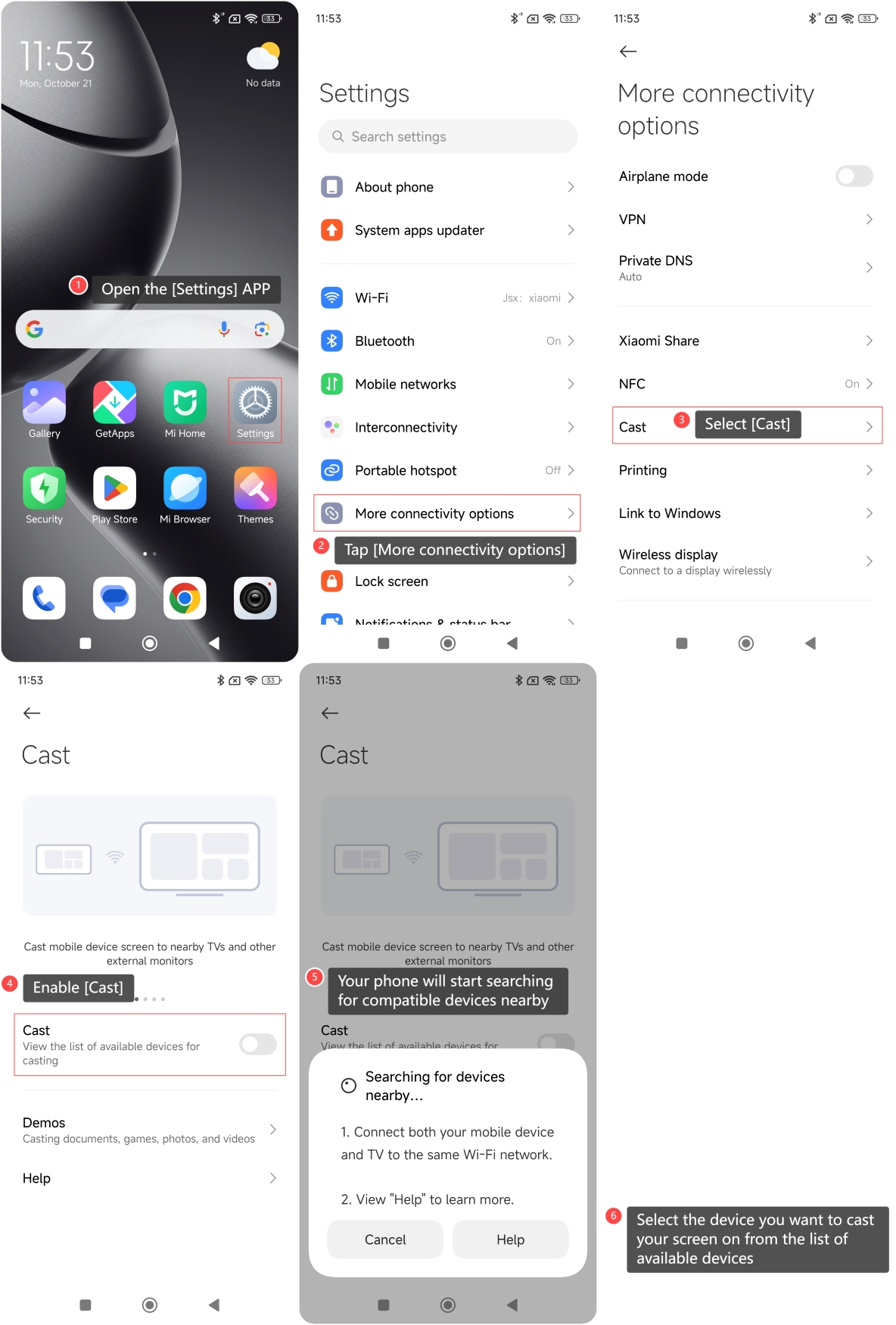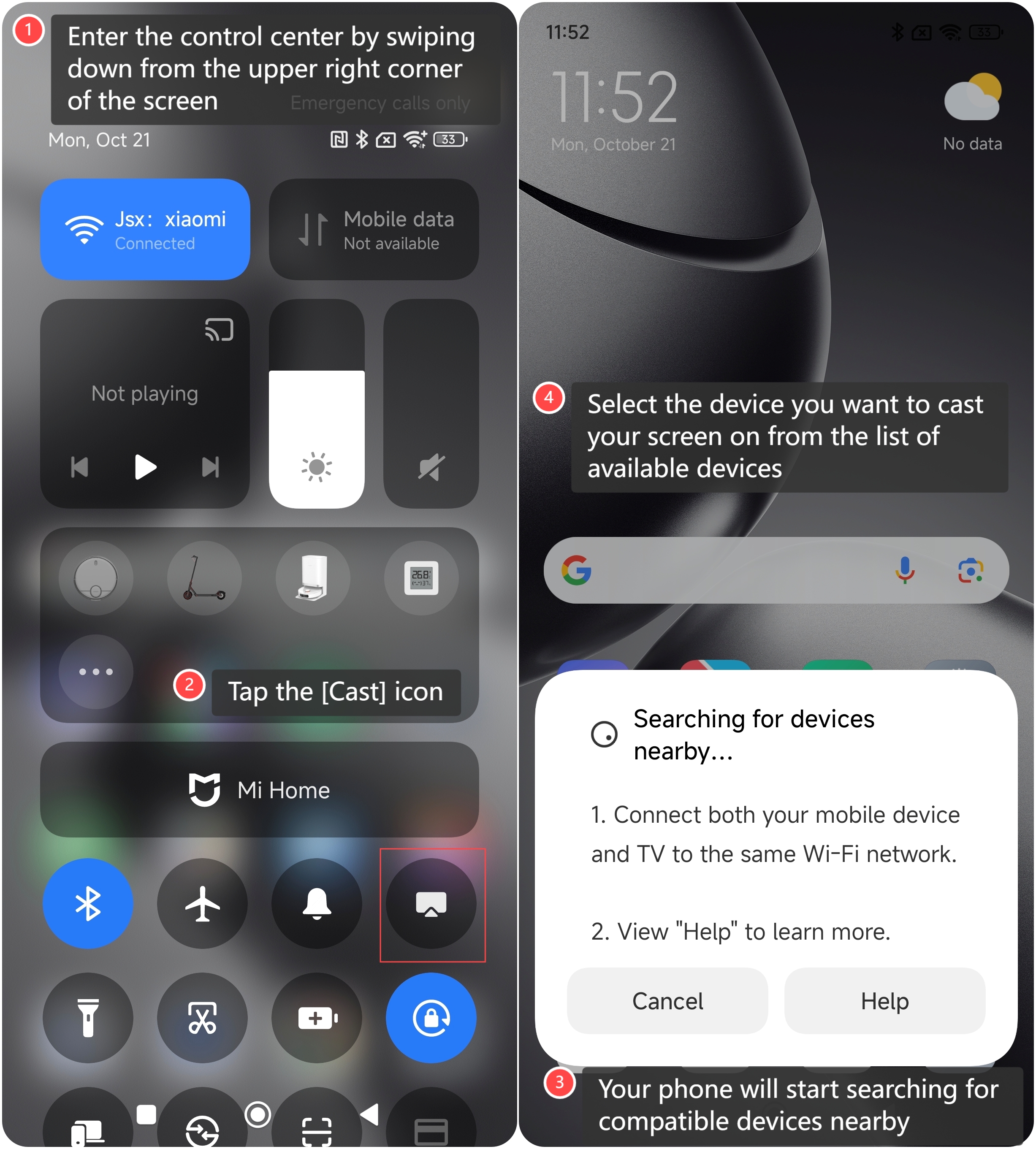 Xiaomi 14T Pro 帶有一項名為 Cast 的功能,可讓您與其他相容的外接顯示器(如智慧電視、流媒體設備或其他顯示器)共用手機螢幕。