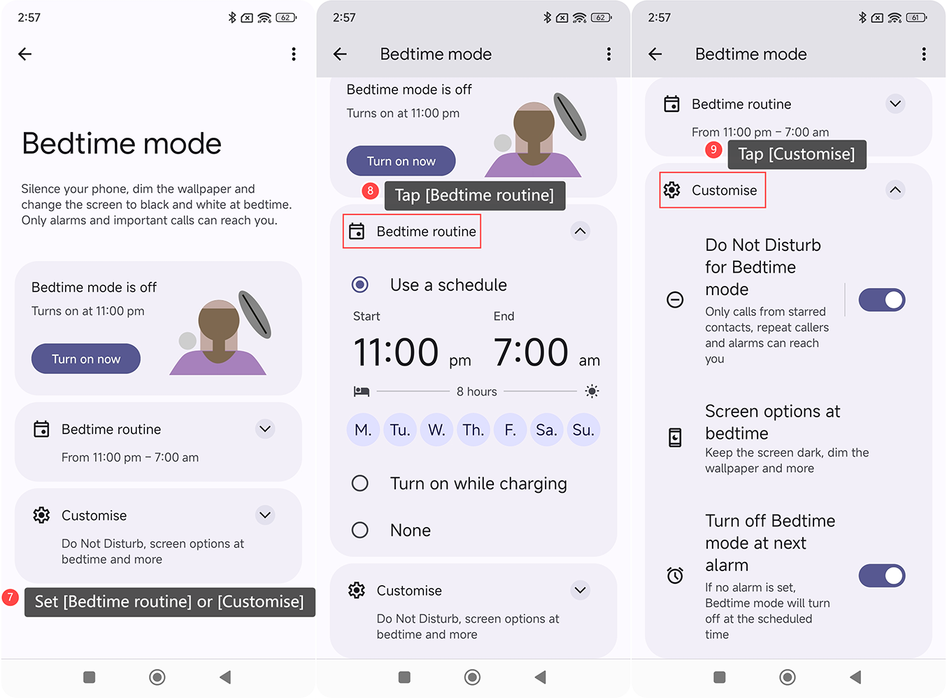 7. 初始設置就寢模式后,每次進入此功能時,您還可以在