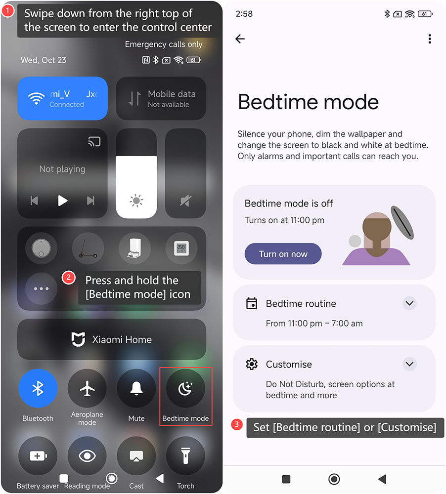 支援 Bedtime 模式,可以降低螢幕亮度並調整色溫以最大限度地減少藍光照射,促進更好的睡眠品質。當您啟用就寢模式時,您的手機將靜音,壁紙將變暗,螢幕將變為黑白。
