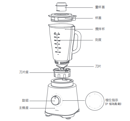頂部是量杯,可以取下量杯添加配料。其下方是蓋子,旨在覆蓋攪拌罐並防止飛濺,必須將其固定好,以便攪拌機運行。混合罐是配料的主要容器,並標有量測線以訓示體積。罐子底部附有刀片組件,其中包含用於切碎和混合的刀片。容納電機的攪拌機底座有一個控制旋鈕,可以調節速度水准,並顯示功率水准。