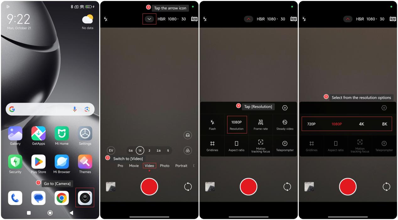 調整在 Xiaomi 14T Pro 上拍攝視頻的解析度允許您在 8K、4K、1080P 和 720P 之間進行選擇。 此外,通過選擇合適的解析度,您可以根據需要優化視頻品質,並確保在共用或編輯視頻時獲得更好的播放性能。