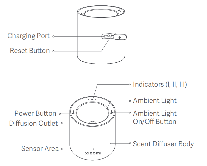 Xiaomi Smart Scent Diffuser的頂部具有電源按鈕、環境燈開/關按鈕、擴散出口、指示燈(I、II、III)和環境燈。設備的側面有充電埠和重置按鈕。感測器區域位於小米標誌上方。