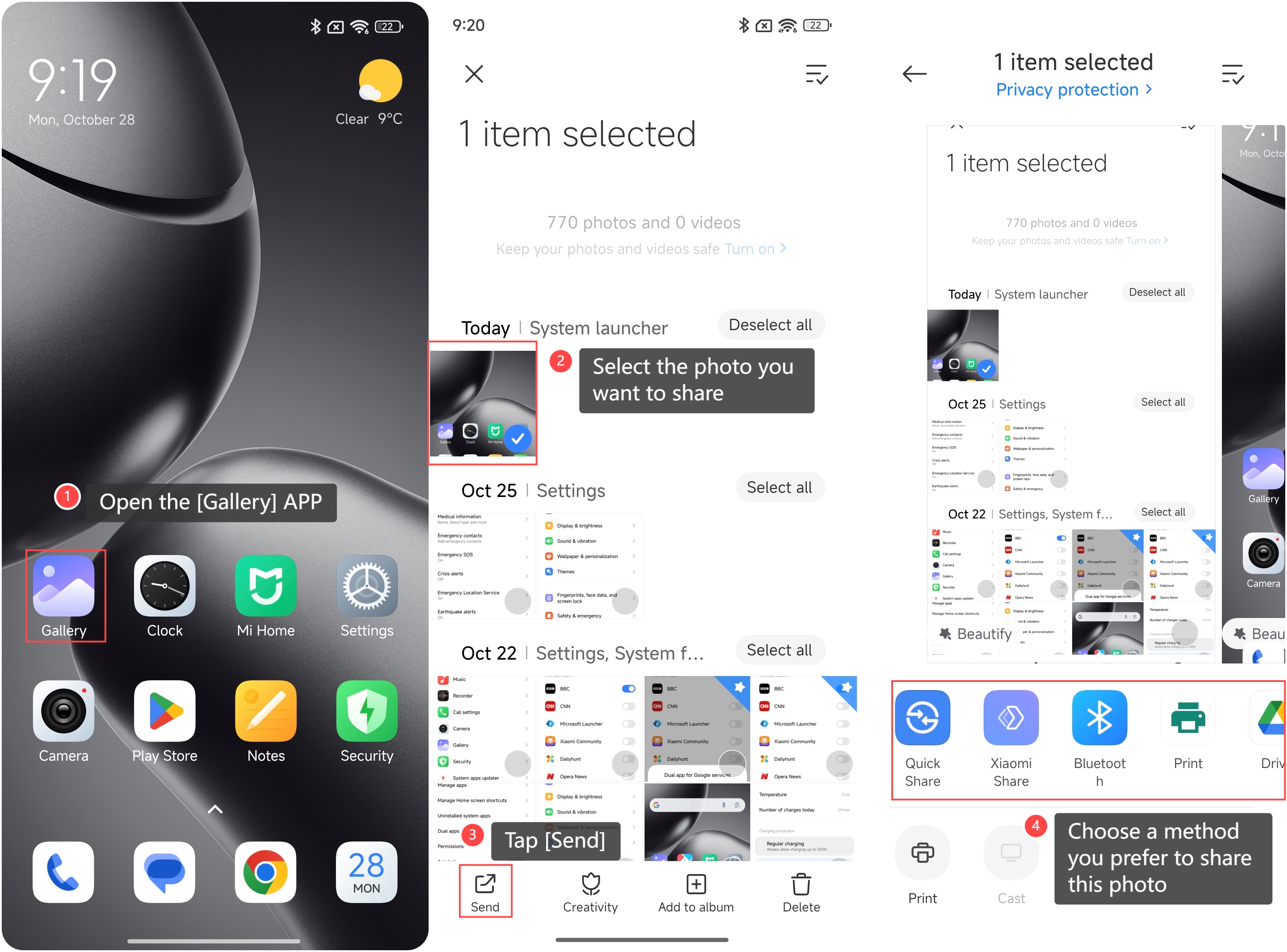 Xiaomi 14T 上內置的 Gallery APP 允許您通過藍牙或其他第三方 APP 直接將照片發送到另一台設備。使用 Gallery 發送照片可以更快地載入、選擇和發送。這為您提供了一種更方便、更高效的發送照片的方式。