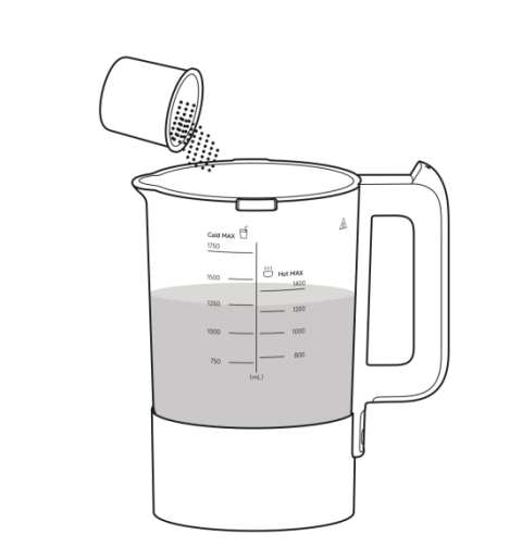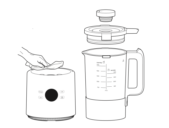 2. 往破壁機內加水至上水位線,長按“清洗”鍵3秒,破壁機自動進入除菌清洗模式,除菌清洗模式完成後,倒掉破壁機內的水,然後用濕布擦拭杯體外部。