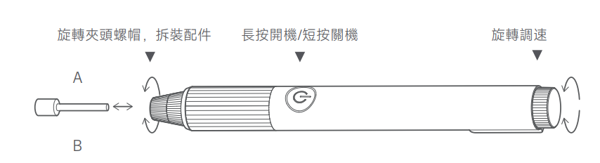 A:安裝相容的配件後,按下電源按鈕啟動米家電磨筆。工具運轉時,您可以使用調速旋鈕無段調整轉速。