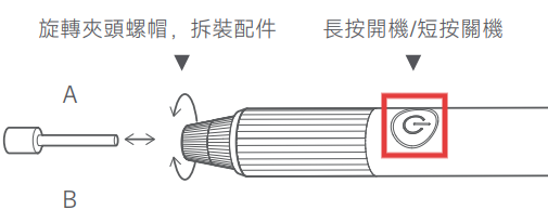 由於馬達本身的特性,即使是同一型號的不同電磨筆,噪音水平也可能略有差異。這種現象屬於正常範圍,請放心使用。
