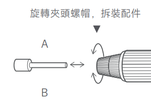 2. 將配件穿過夾頭螺帽插入夾頭內,確認配件桿插至夾頭底部。
