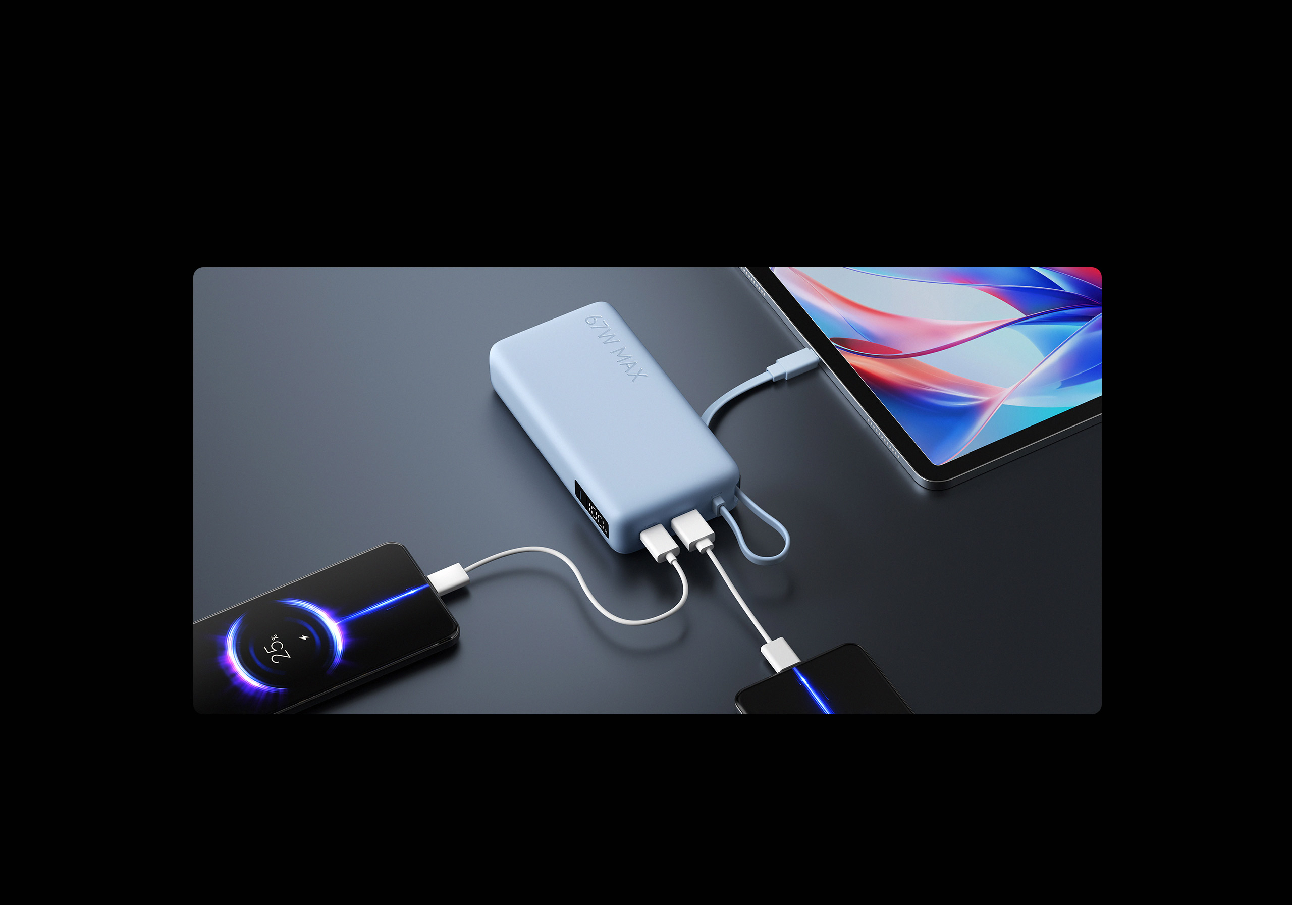 Con la porta USB-C integrata e altre due porte USB-C e USB-A, il power bank può ricaricare fino a tre dispositivi contemporaneamente*. Condividi energia con gli amici e dimentica le code alle stazioni di ricarica.