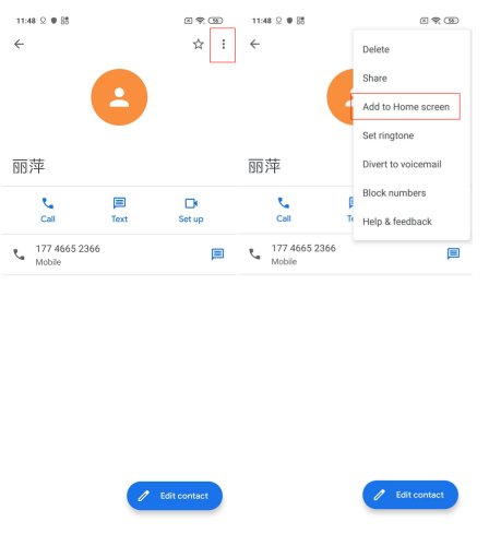 Metodo di impostazione specifico: selezionare i contatti-fare clic sui tre punti nell'angolo destro-Aggiungi alla schermata Home.