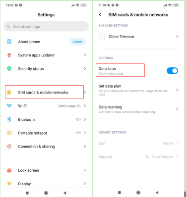 Metodo di impostazione specifico: Impostazioni>> scheda SIM e reti mobili>>Dati attivi.