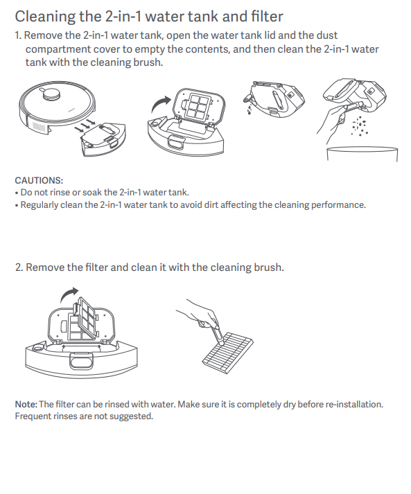 R: Dai la priorità alla modalità di aspirazione. Nelle scene in cui c'è molta polvere e detriti in casa, non utilizzare la funzione di pulizia per la prima volta. Selezionare la modalità di aspirazione per completare la pulizia globale prima di riempire d'acqua il serbatoio dell'acqua. Installare il gruppo mocio sul serbatoio dell'acqua 2 in 1 e selezionare la modalità di aspirazione e pulizia.