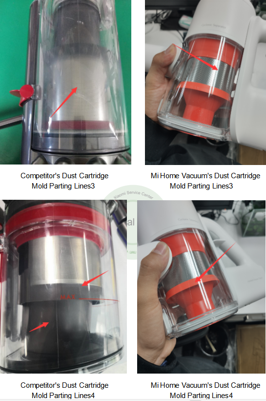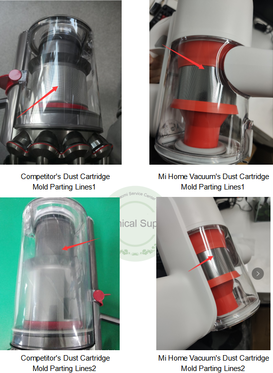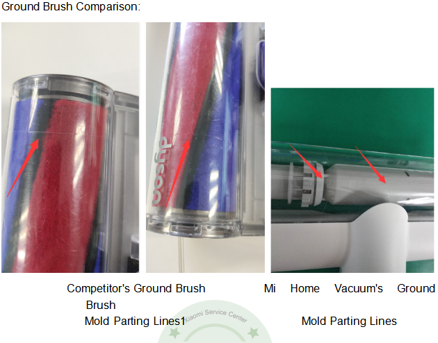Mold Parting Lines: Most injection molds are made up of several parts, and it's impossible to make a completely smooth surface where the molds meet. This is because the molds have a small gap where they meet. When the mold is filled with plastic, a small protrusion will be formed. This is what we call a mold parting line. Below is a comparison between the Mi Home Hand-held Wireless Vacuum and other brands' mold parting lines.