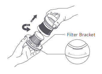 4. Dopo la pulizia e l'asciugatura completa, reinstallare il filtro e il separatore a ciclone nella staffa del filtro in senso orario in ordine. Quindi posizionare il gruppo separatore a ciclone nello scomparto polvere e premerlo con decisione;