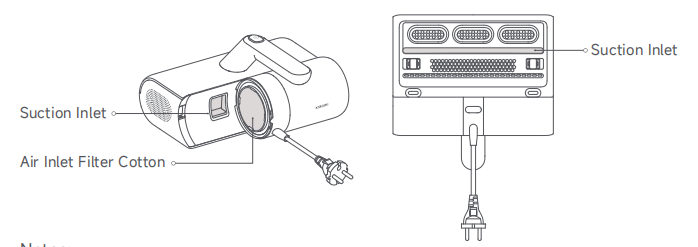 1. È normale che polvere e altre particelle aderiscano ai due ingressi di aspirazione. Si prega di pulirli regolarmente;