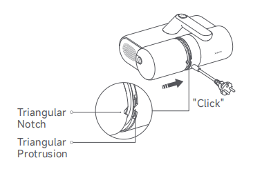 4. Allineare la tacca triangolare del gruppo dello scomparto polvere con la sporgenza triangolare sull'aspirapolvere per acari della polvere, quindi spingere il gruppo dello scomparto polvere nell'aspirapolvere. È installato correttamente quando si sente un "clic".