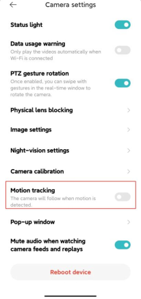 Apri l'APP Mi Home >> tieni premuto il dispositivo >> tocca il "..." nell'angolo in alto a destra >> accedere a [Impostazioni fotocamera] >> attivare [Rilevamento movimento]. Se abilitata, la funzione di rilevamento del movimento consente alla telecamera di seguire il movimento rilevato. Dopo il tracciamento, ritorna alla posizione originale per il monitoraggio continuo.