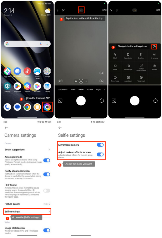 Per attivare le impostazioni selfie sulla fotocamera, segui questi passaggi: