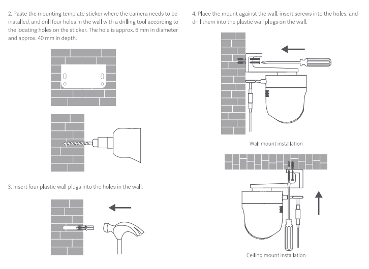4. D: Qual è l'ingresso nominale della telecamera per esterni Xiaomi CW400?A: 12V1A. Per l'uso normale, assicurarsi di utilizzare l'adattatore originale.5.D: Quali sono le opzioni di installazione per Xiaomi Outdoor Camera CW400?A: Sono disponibili tre metodi di installazione: montaggio a soffitto, laterale o su palo. Gli utenti possono Scegli il metodo di installazione di cui hanno bisogno.6.D: Quali sono i passaggi per il montaggio a parete della Xiaomi Outdoor Camera CW400?A:Vedere il diagramma dei passaggi di installazione