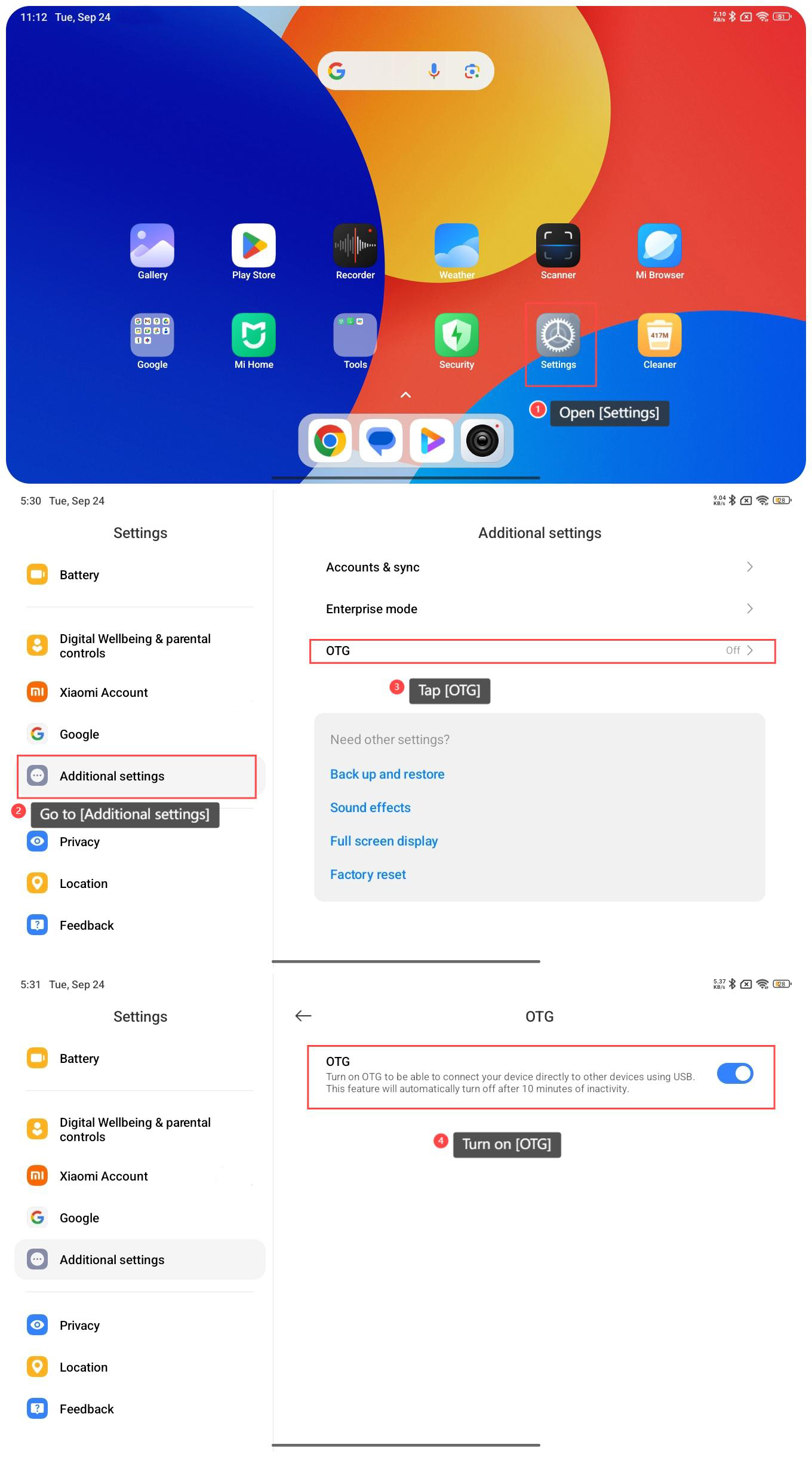 Per attivare OTG sul Redmi Pad SE 8.7 4G, fare riferimento ai seguenti passaggi: