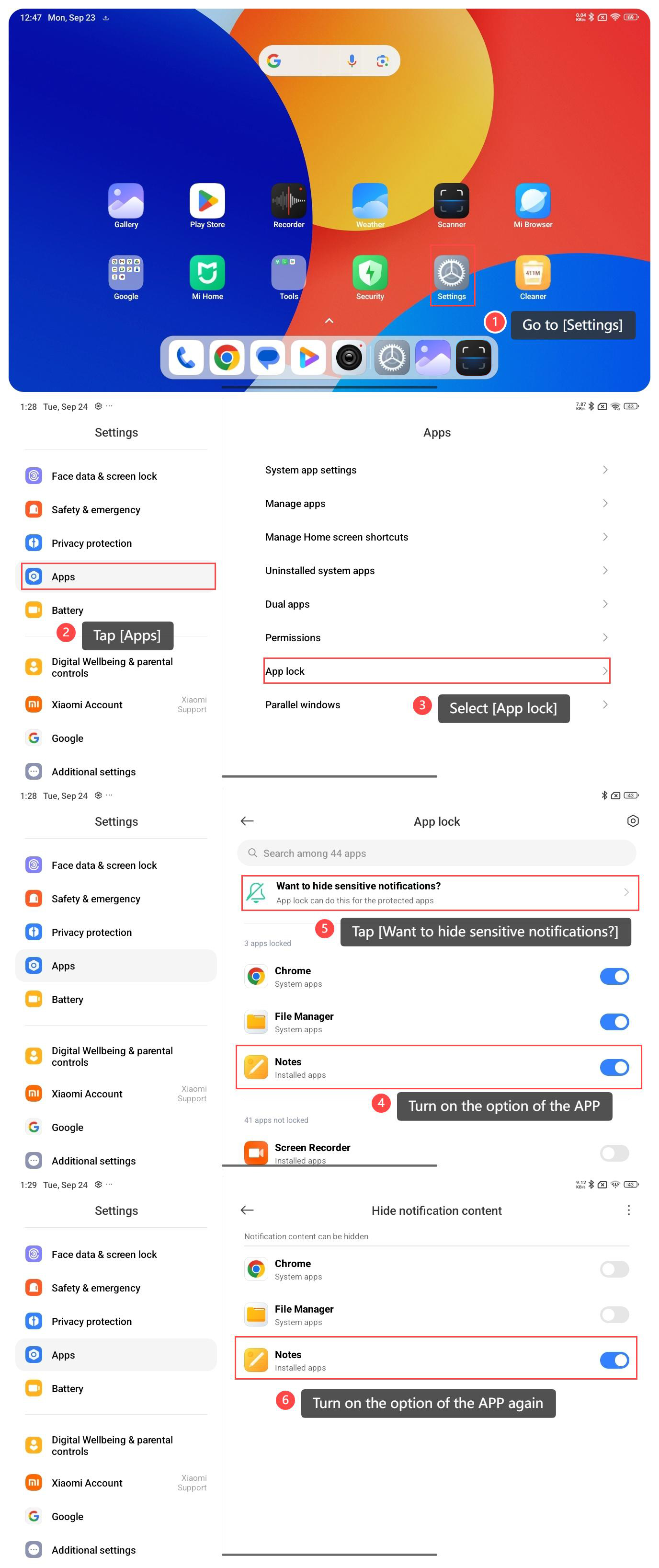 Dopo aver attivato il blocco app, puoi abilitare la funzione Nascondi contenuto di notifica sul Redmi Pad SE 8.7 4G. Significa che il contenuto delle notifiche delle app protette sarà nascosto.