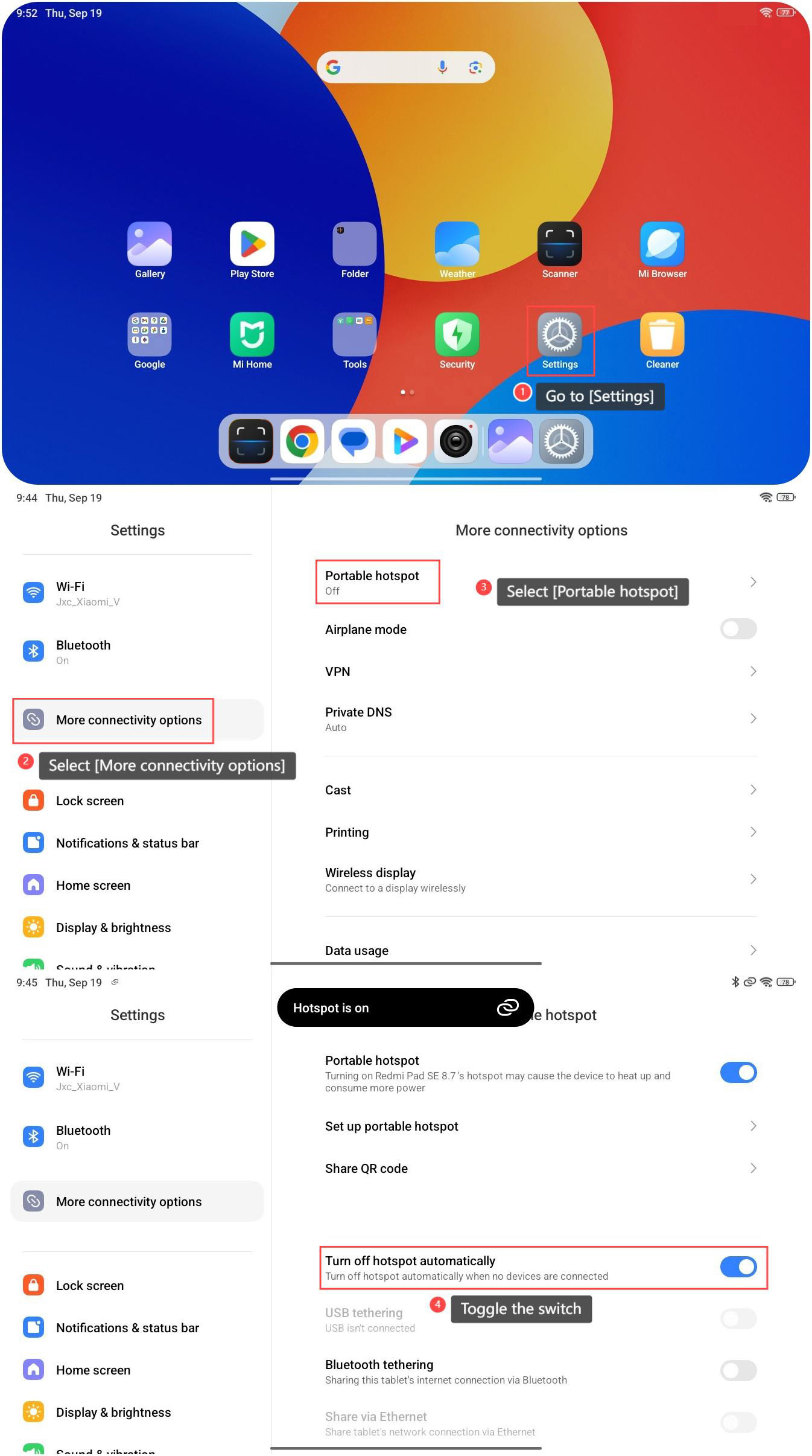 Il Redmi Pad SE 8.7 supporta la funzione integrata di disattivare automaticamente l'hotspot quando non sono collegati dispositivi. Nel caso in cui dimentichi di spegnere l'hotspot in tempo, questa funzione può disattivare automaticamente l'hotspot per ridurre l'utilizzo della rete.